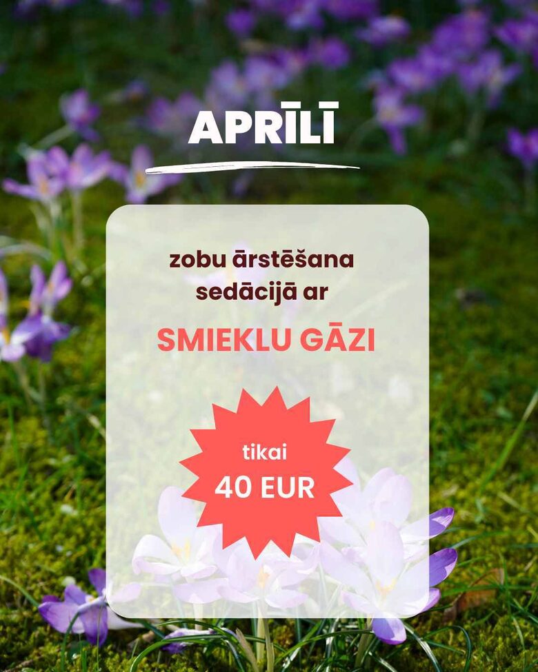 Aprīlī piedāvājam sedāciju ar smieklu gāzi par 40 € (pilnā cena 60 €), lai vizīte būtu mierīgāka gan bērniem, gan pieaugušajiem.